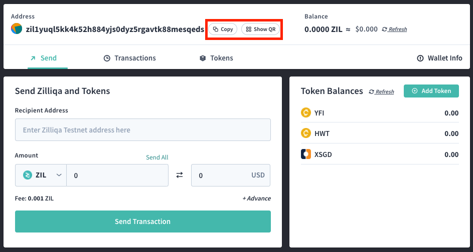 CopyORShow QRbuttons to send your Zilliqa address to the sender’s wallet. - ⚠️ Do note that all valid Zilliqa addresses begins with
