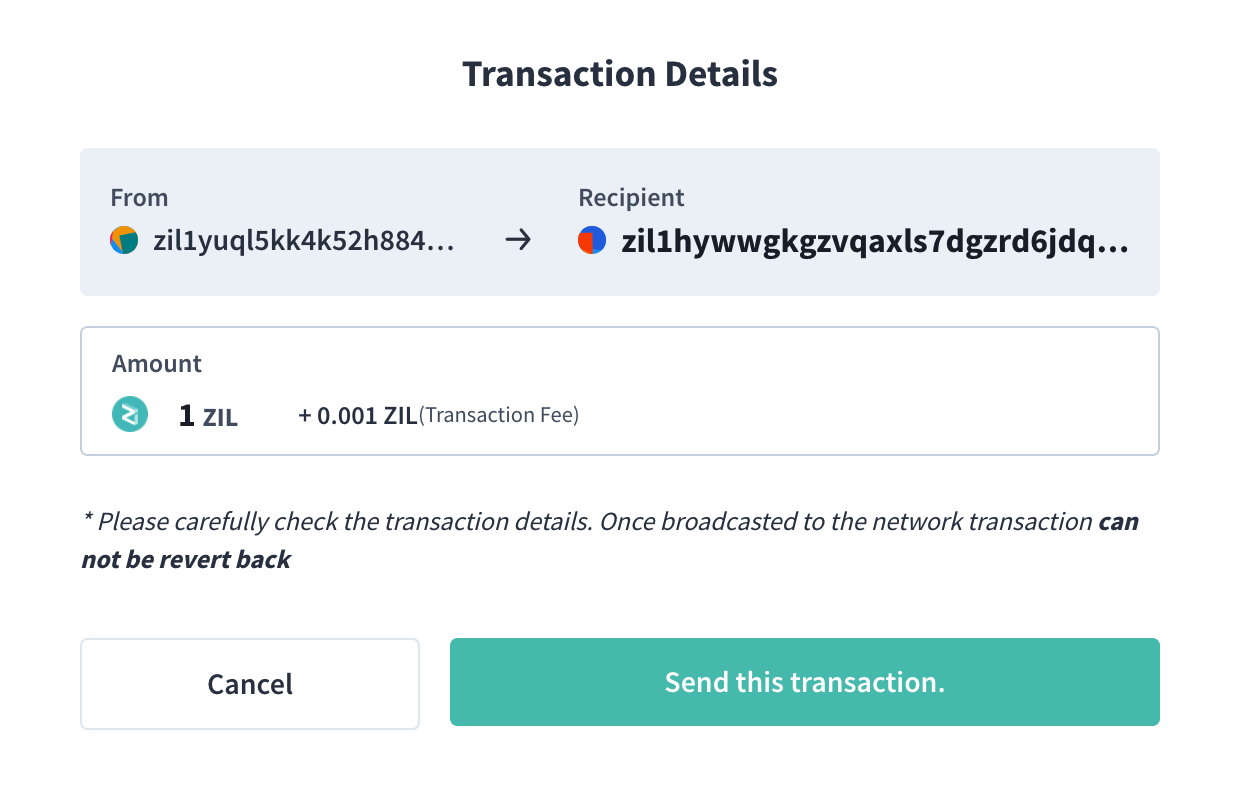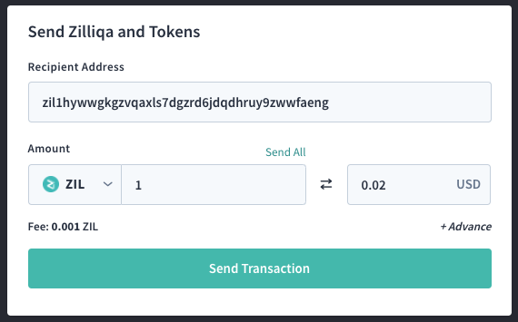 Recipient Address, choose the digital asset you wish to send ($ZIL in this case), input theAmountyou wish to send, then click onSend Transaction;