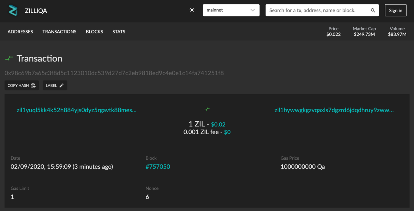 - Navigate to the Zilliqa block explorer viewblock.io to check the status of your transaction! You may need to wait awhile for the transaction to be confirmed - factor in waiting time of around 1-2 minutes.