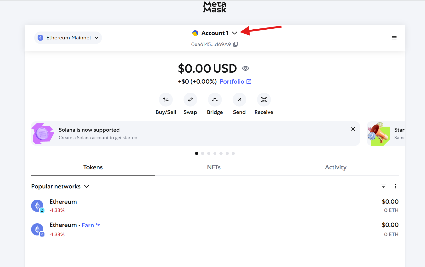 - Your Metamask wallet is now created. Click the dropdown above wallet address.