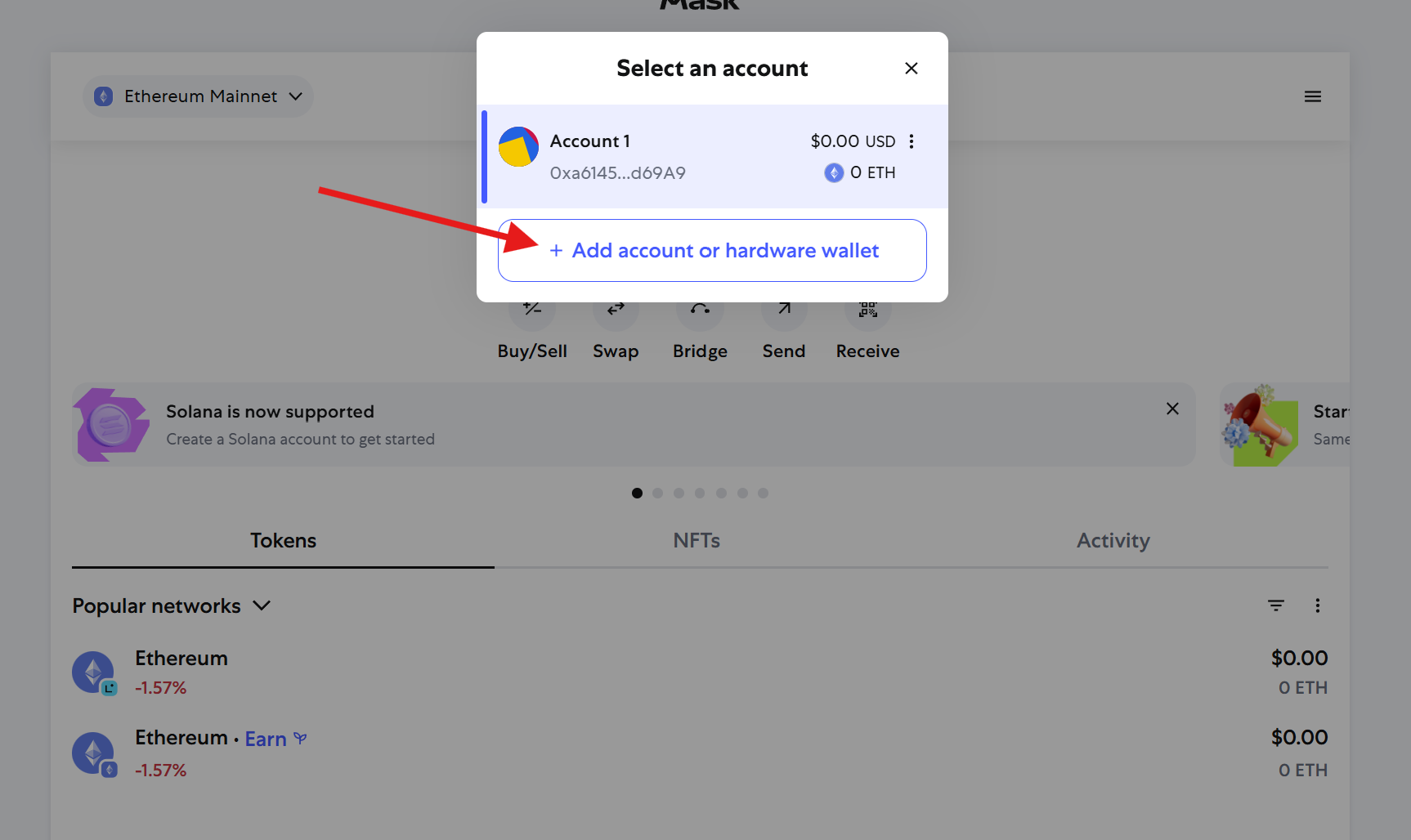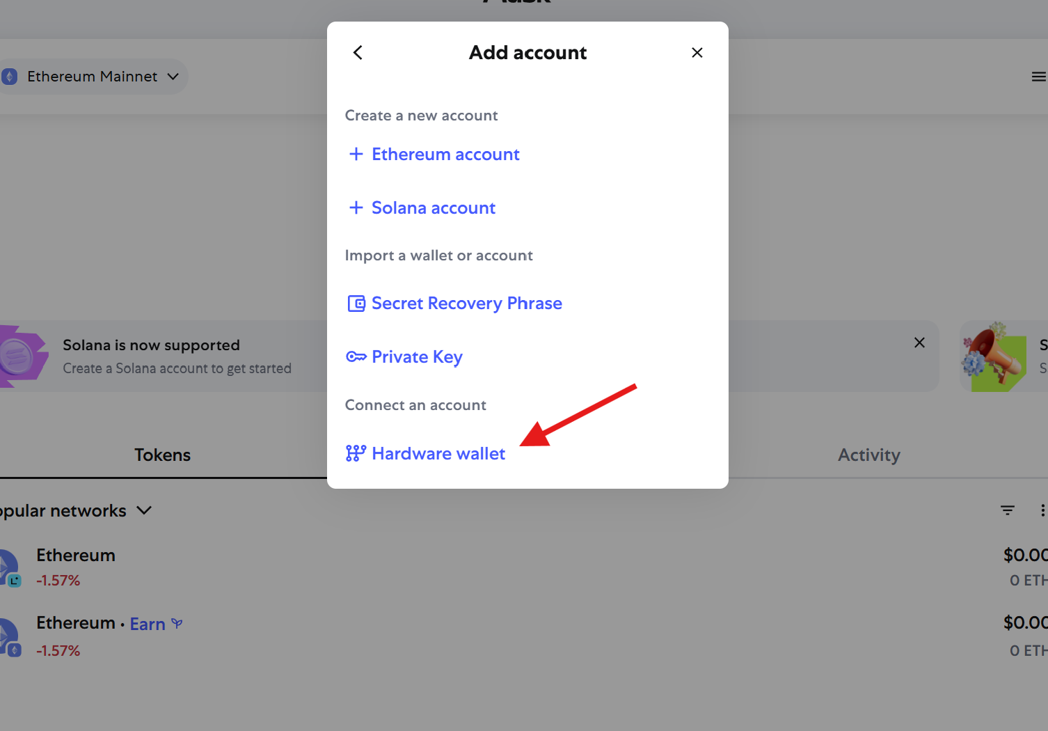 - Select “Add account or hardware wallet”, then choose “Hardware wallet”.