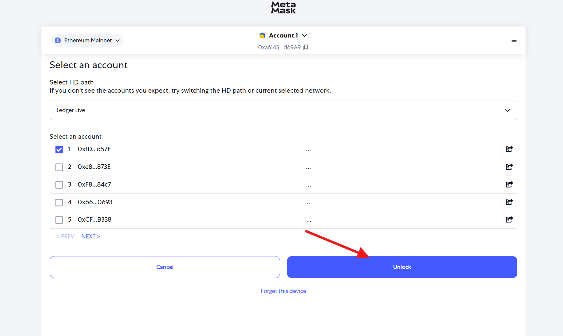 - Choose the address you wish to use from your Ledger and click “Unlock”.