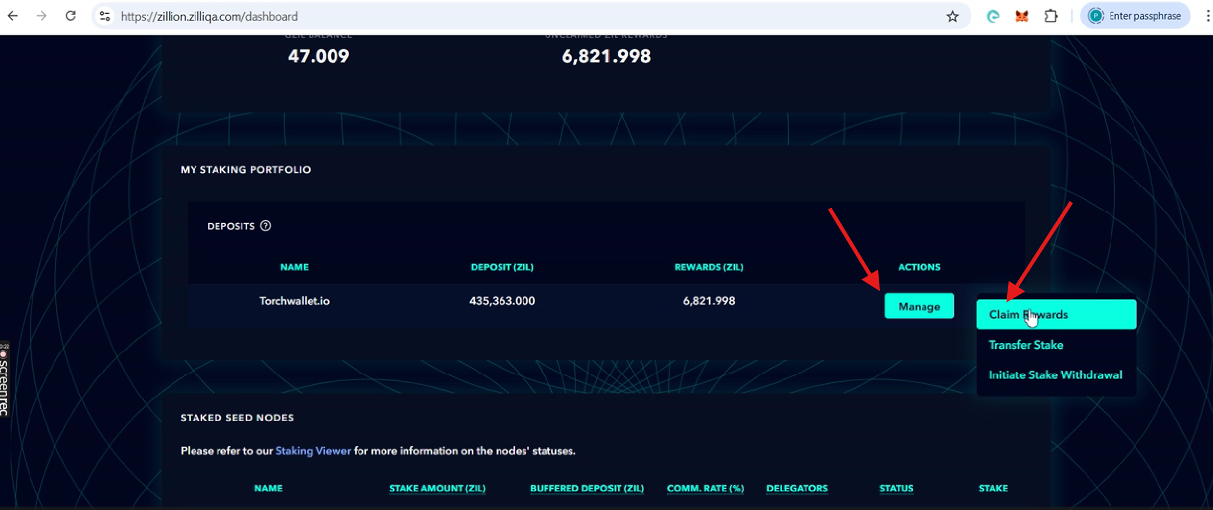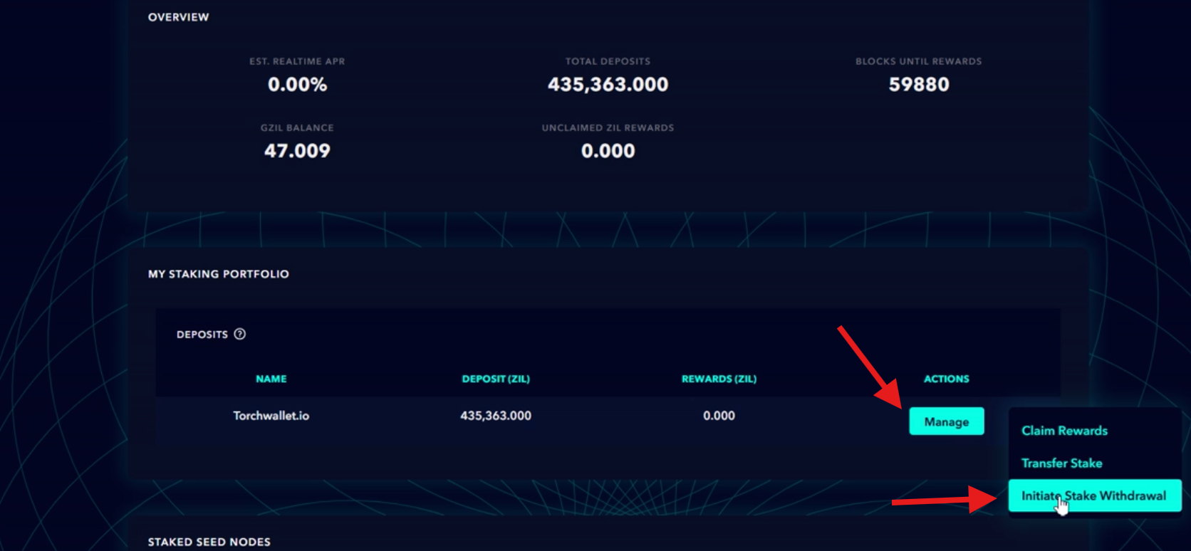- After the transaction is processed, click "Manage" again, then "Initiate Stake Withdrawal", and confirm the transaction in ZilPay.