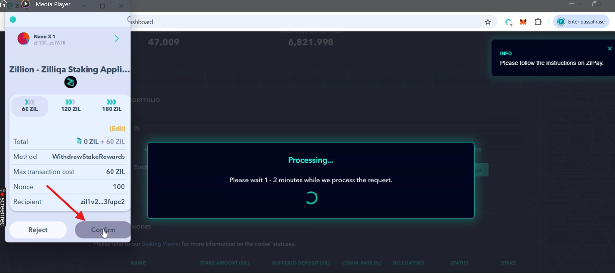 - A pop-up will appear in ZilPay asking for confirmation. Click "Confirm" to approve the transaction.