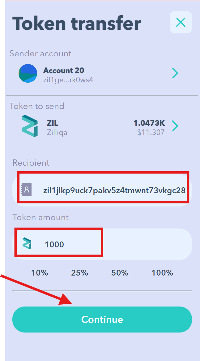 - Paste the copied zil1 address, enter the amount of ZIL you want to send, and click "Continue".