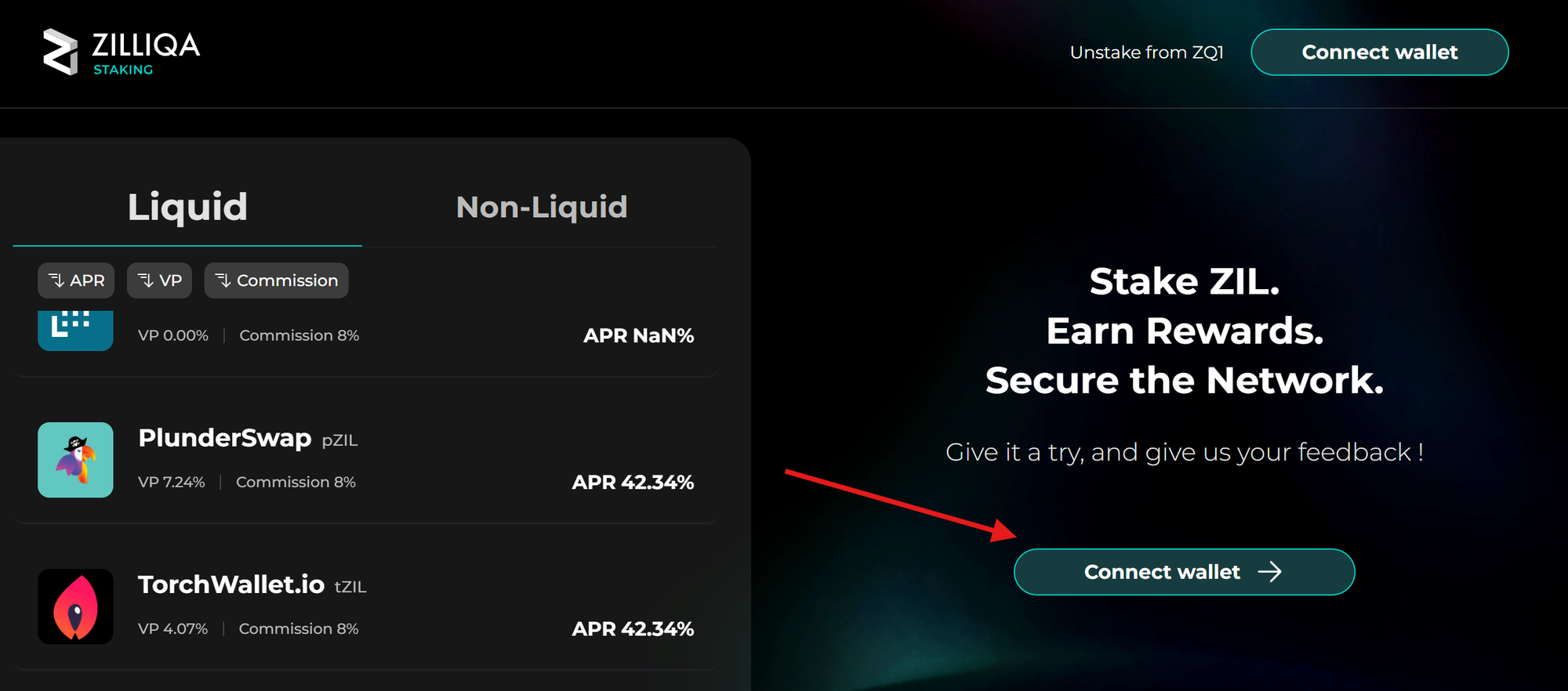 - Visit the New staking platform at https://stake.zilliqa.com/ and click “Connect wallet” to connect using Metamask.