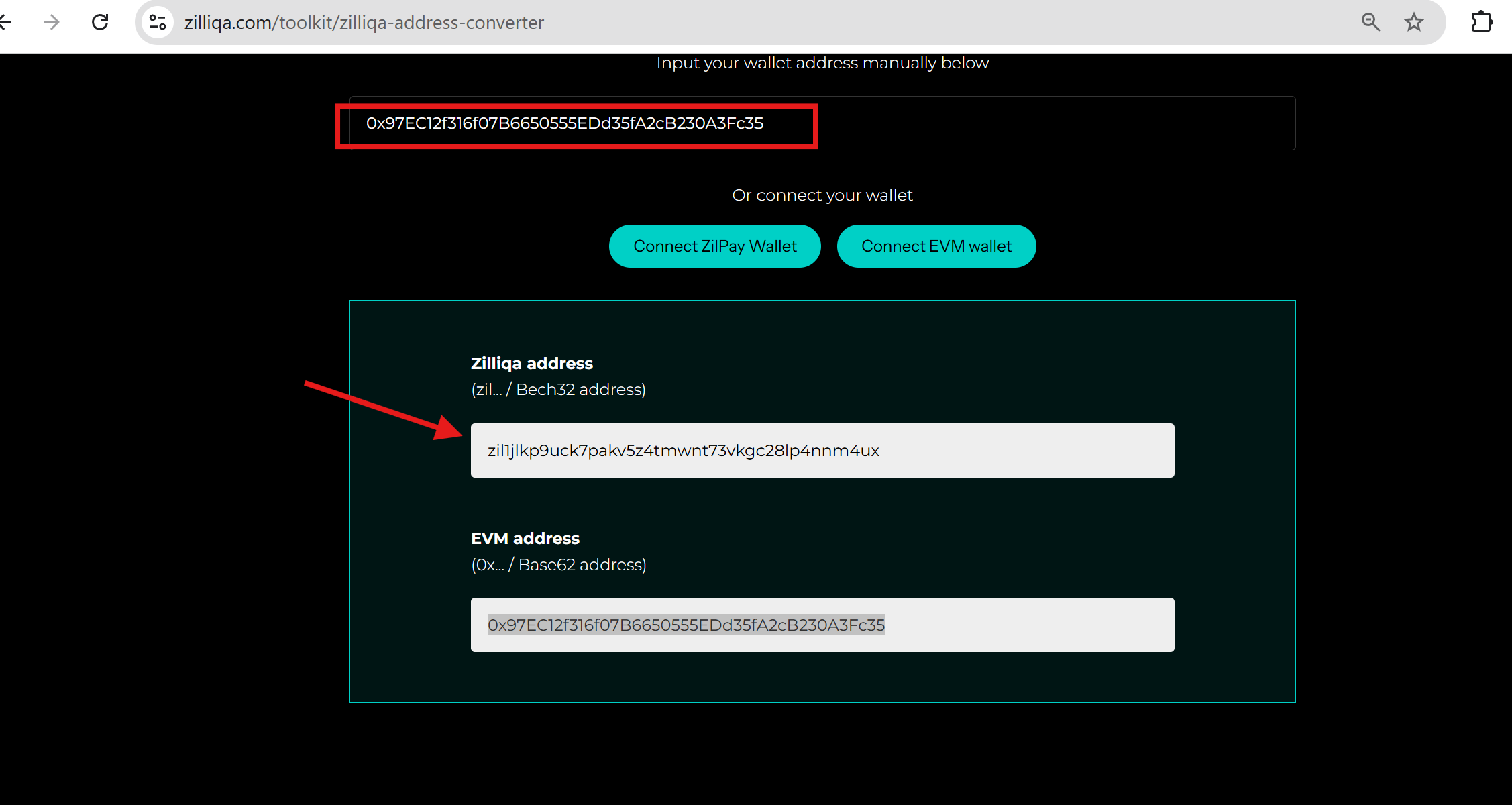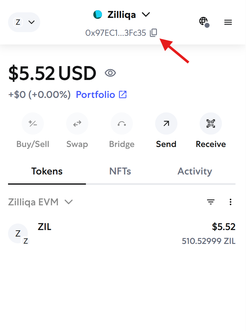 - Visit Zilliqa Address Converter, paste the 0x address into the search bar, and copy the converted zil1 address.
