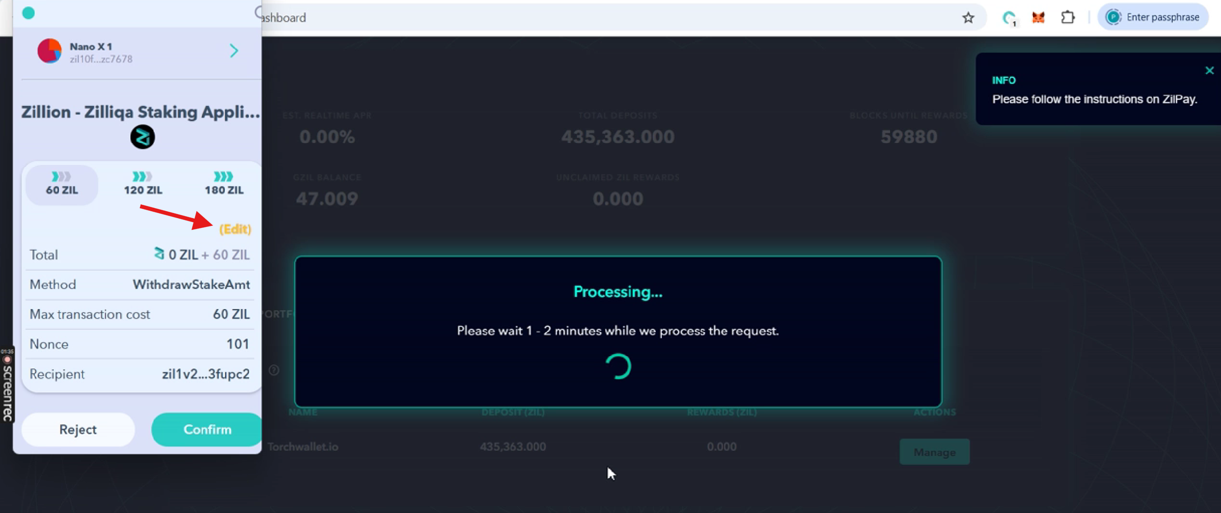 - In Step 3, when the ZilPay pop-up appears, click "Edit" before confirming the transaction.