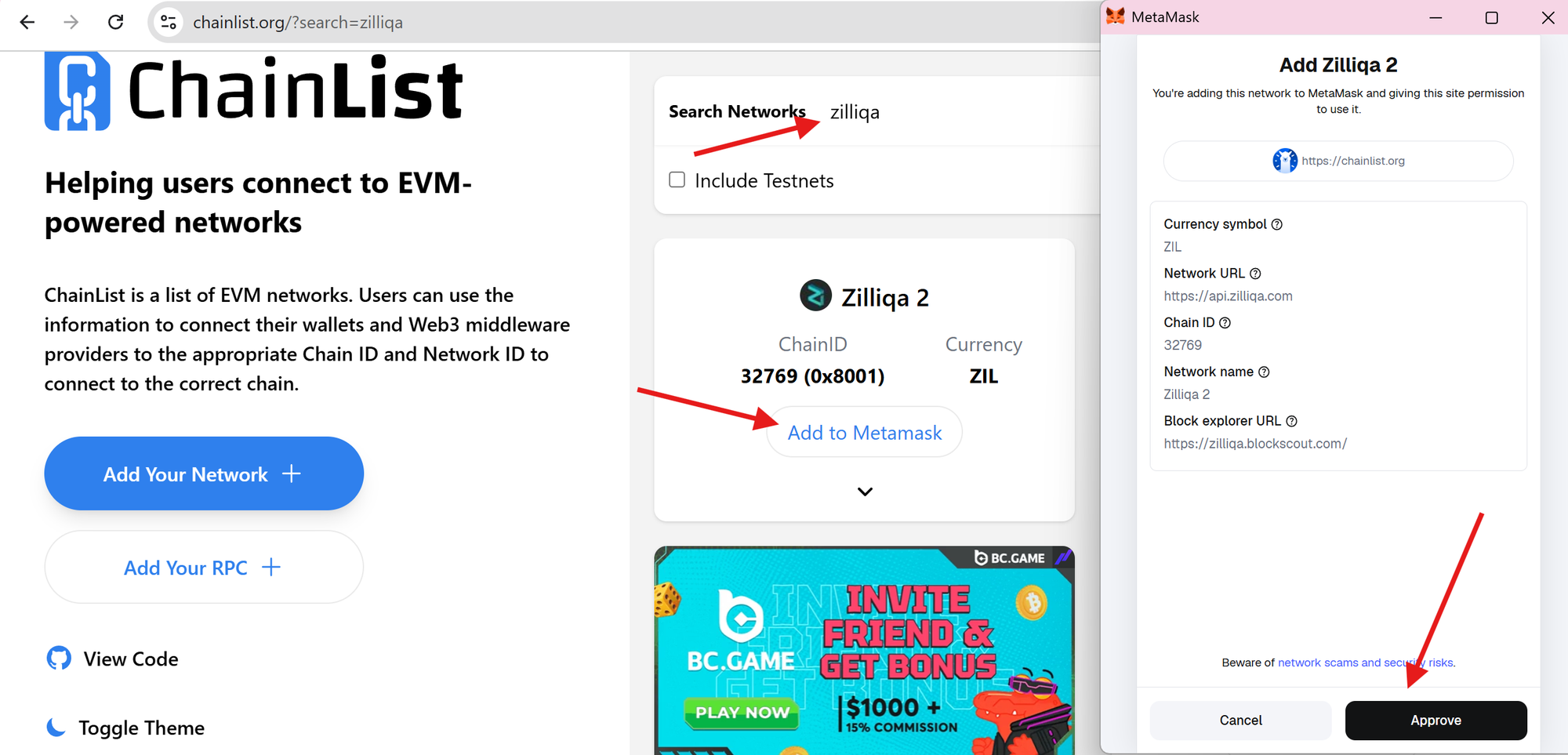 • Click the "Add to Metamask". When prompted by Metamask, click "Approve" to add the network.