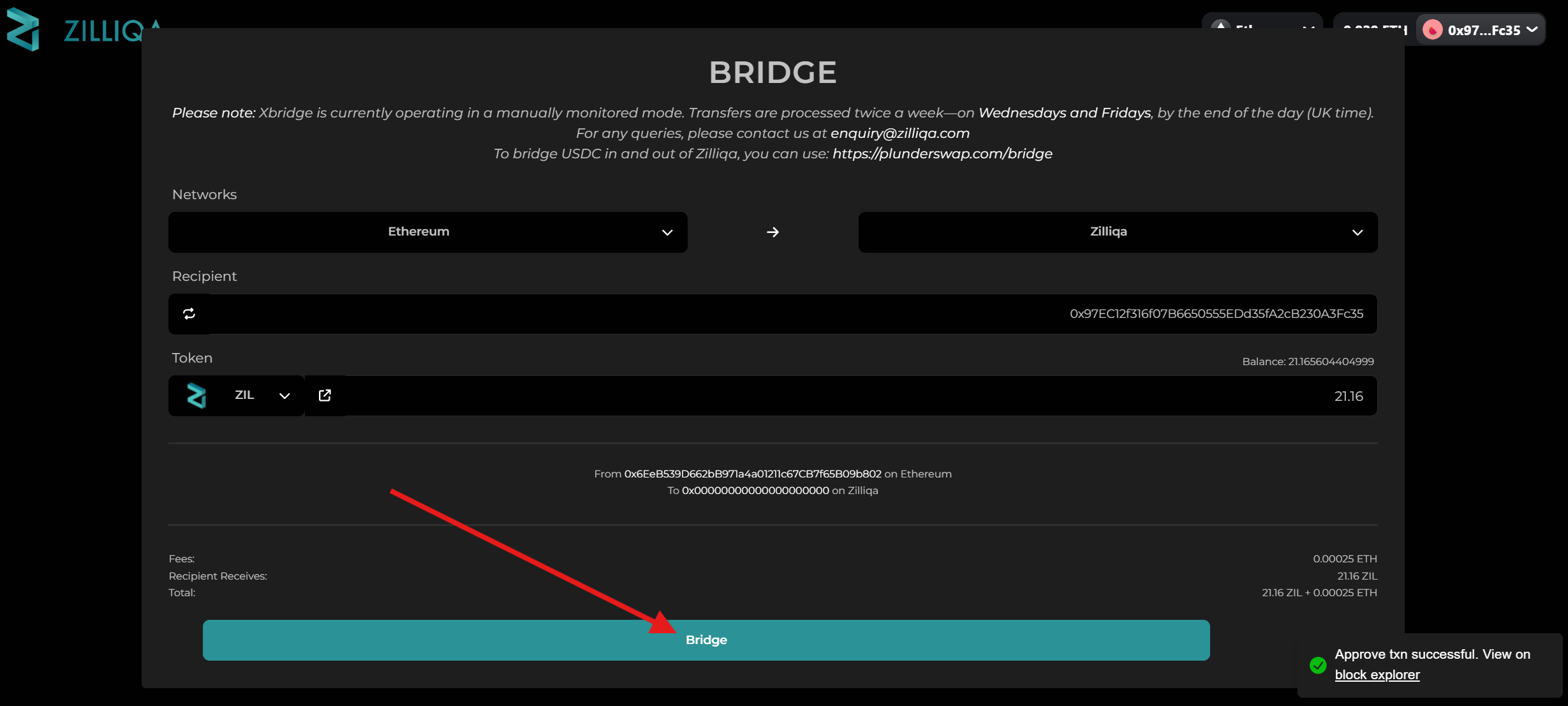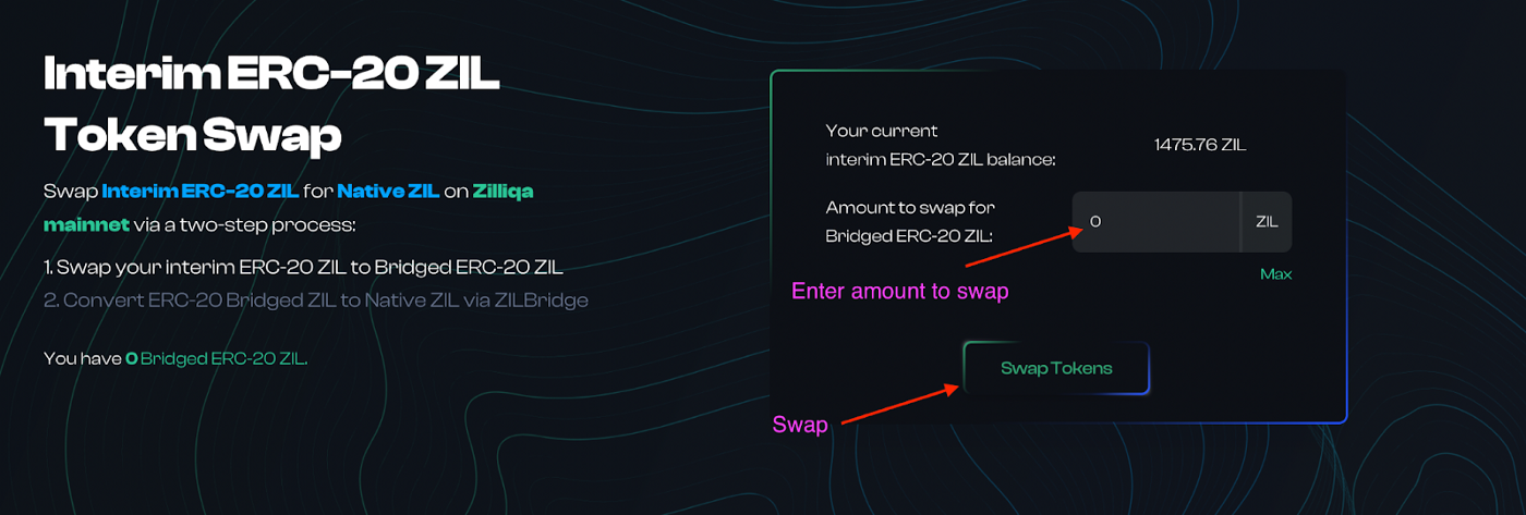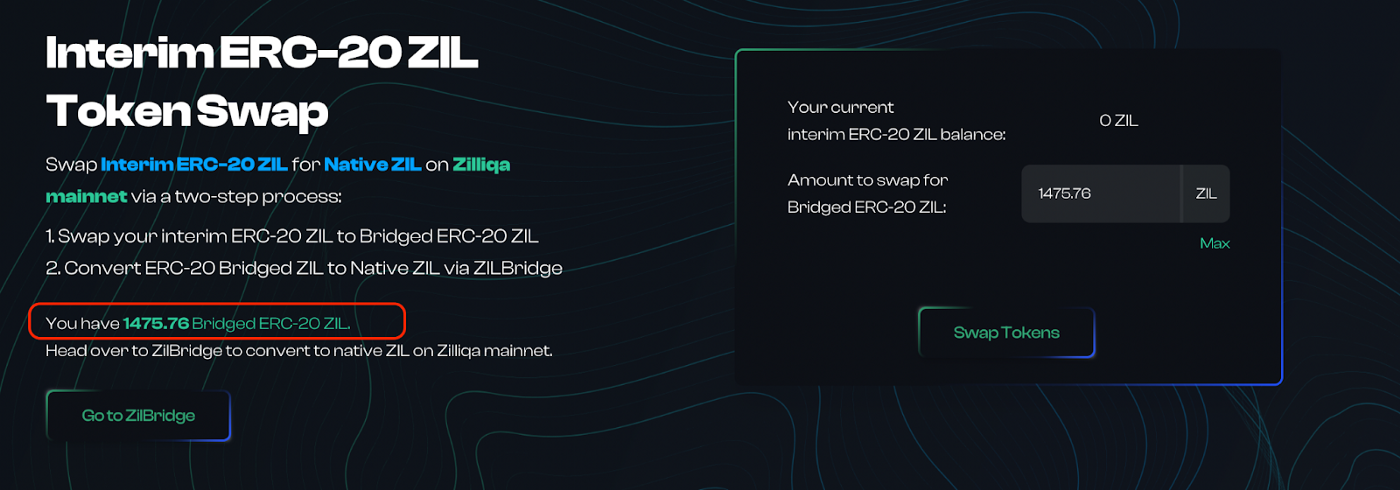 At this stage, we are halfway through. You have successfully swapped your interim ERC-20 ZIL for bridged ERC-20 ZIL. This swap is loss-less, i.e., you should expect to receive the same number of Bridged ERC-20 ZIL as the number of interim ERC-20 ZIL.