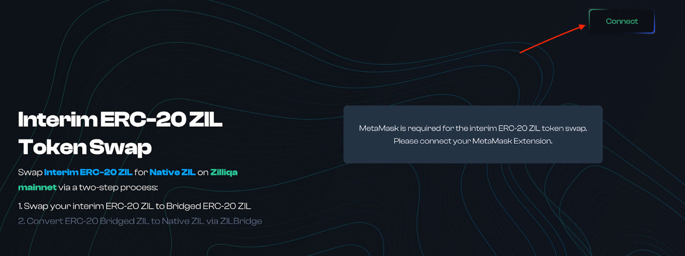 - Go to tokenswap.zilliqa.com and connect your Metamask extension to the token swap application by clicking on the “Connect” button on top-right.