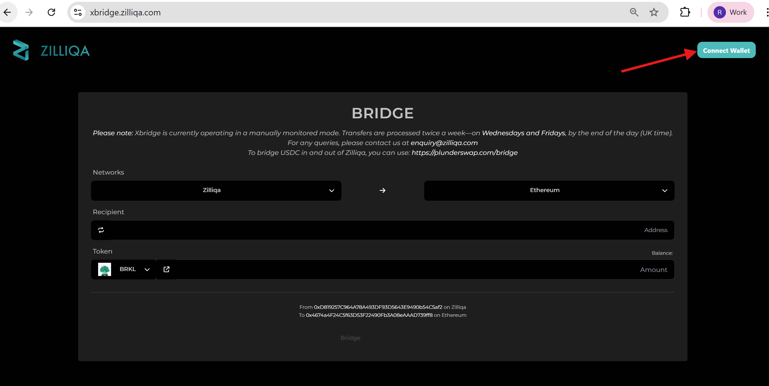 - Go to https://xbridge.zilliqa.com/ and connect Metamask wallet.