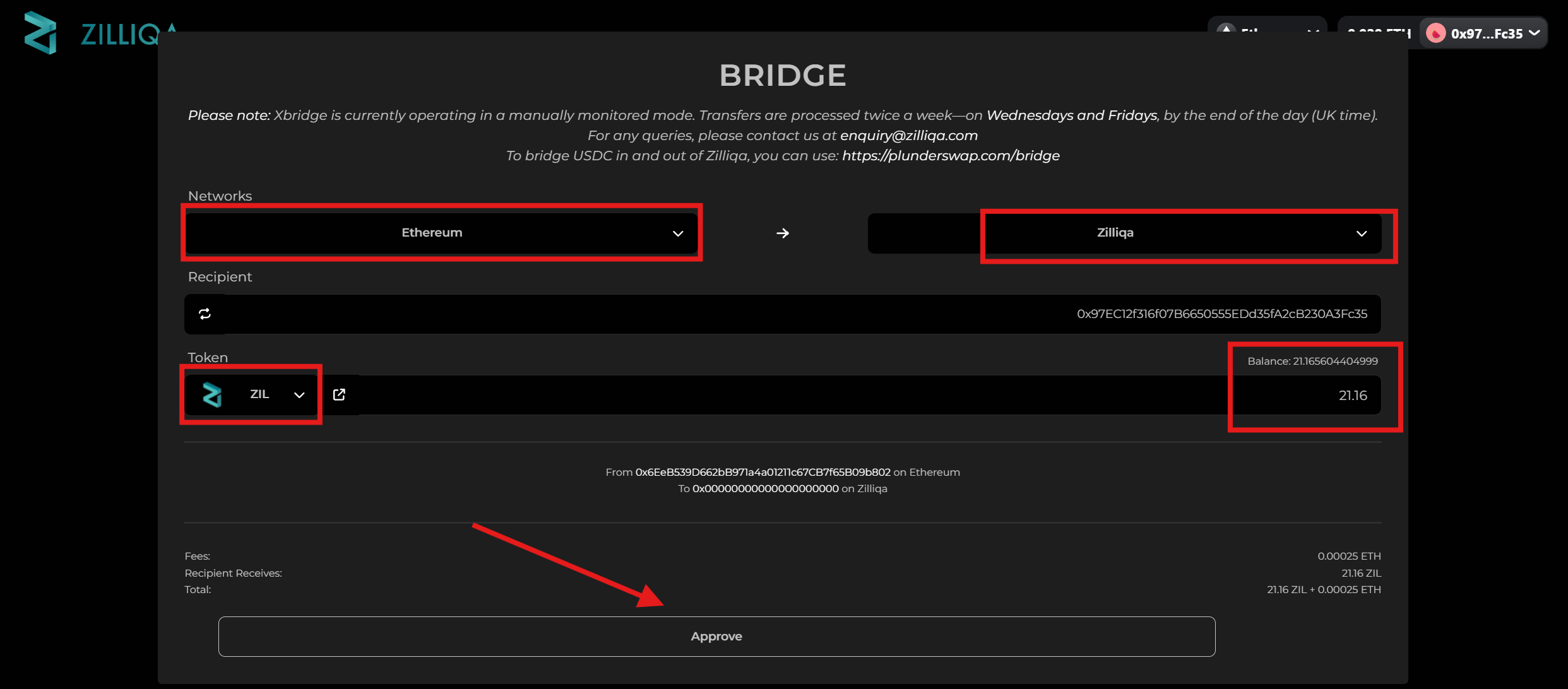 - Once wallet is connected, choose Ethereum as source network and Zilliqa as destination chain. Select token "ZIL" from drop down, enter token amount to swap and click "Approve".