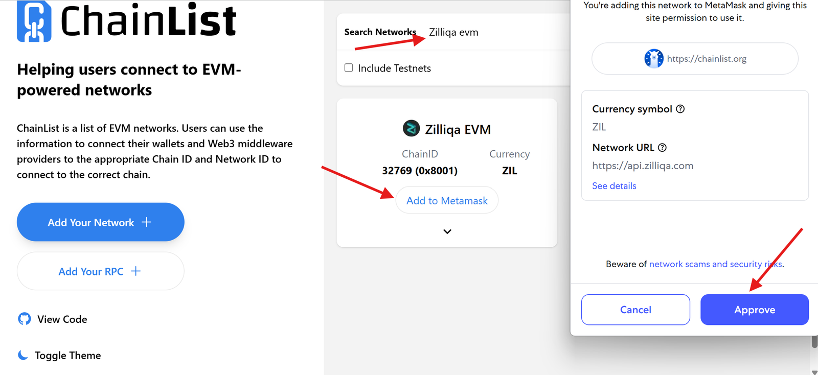 Visit https://chainlist.org, and In the search bar, type "Zilliqa EVM". Click the "Add to Metamask". When prompted by Metamask, click "Approve" to add the network.