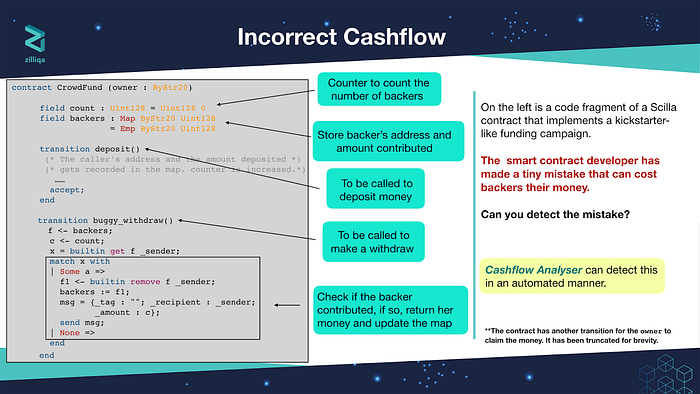 Scilla, the new intermediate-level smart contract language that we designed for Zilliqa addresses some of these pitfalls. One of the benefits of Scilla is that it makes it easier to write static analysers that can identify potential bugs in the applications before they go live. Leveraging the language design, we have created the first ever Cashflow analyser for smart contracts written in Scilla. The cashflow analyser allows developers to track and tag the usage of money, i.e., ZILs, in a smart contract before the contract gets deployed. The goal of doing so is to identify code errors that could potentially leak, mishandle or misappropriate money in applications — all of which can lead to devastating results.