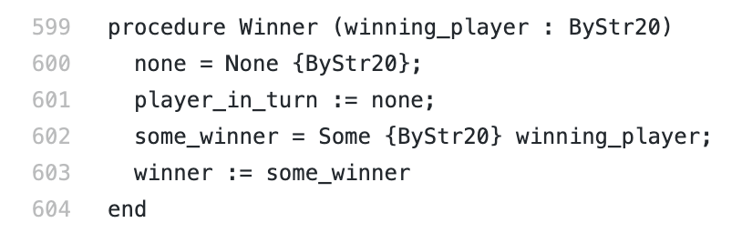 Since the contract is supposed to shut down once the game is over, the procedure Winner updates all the fields which to ensure that nothing further happens in the contract. The procedure is called from two different places — one when a player resigns, and one when a King is taken by another piece. Without a procedure, the code in the procedure body would have to be duplicated, as is the case in the original Shogi contract.