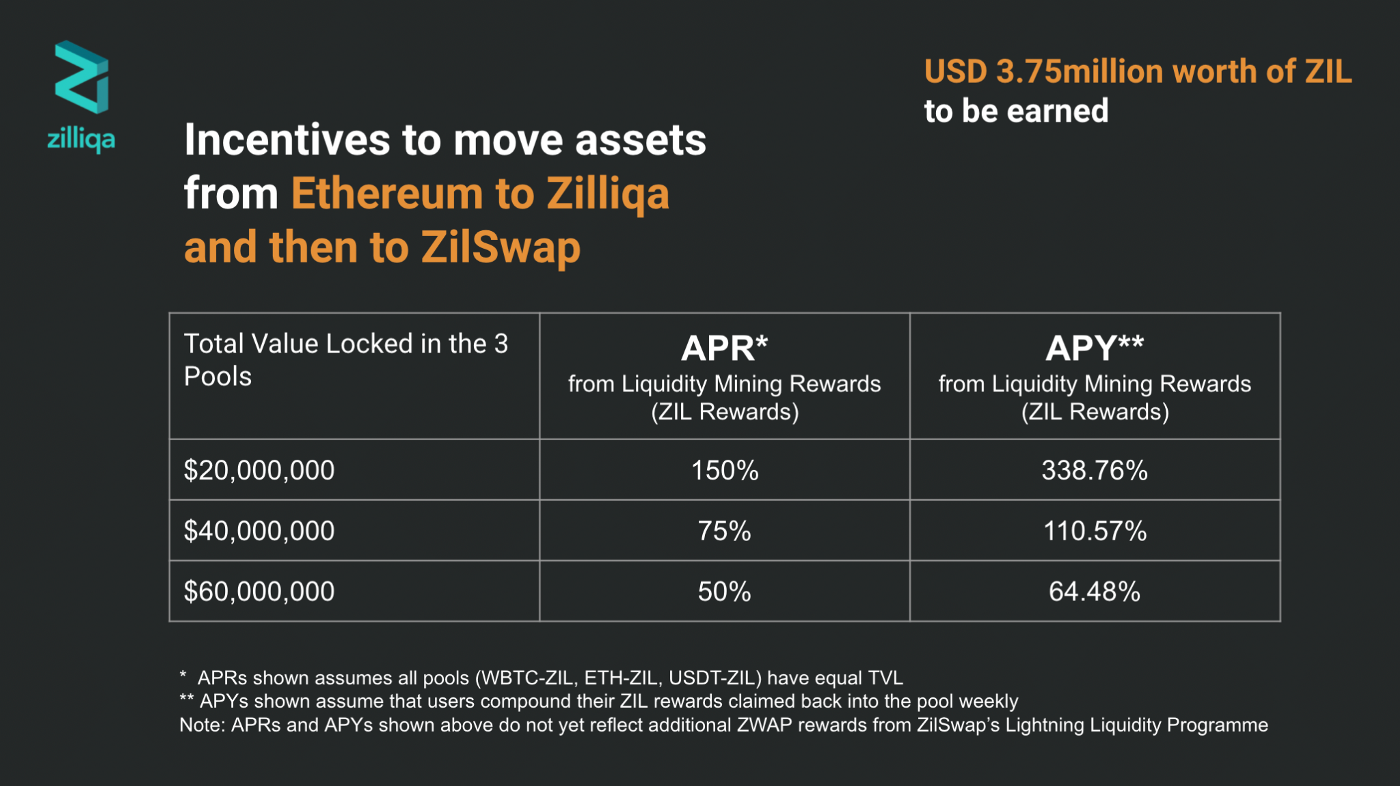 To incentivise early users to bridge over their ERC-20 assets and bootstrap liquidity, incentives worth 45.3M ZIL (US$3.75M) will be distributed to those who pool their assets on ZILSwap; this will begin Oct 6, for a total of 6 weeks . Liquidity providers on any of the aforementioned pools can potentially earn high yields on liquidity mining incentives alone. With ZWAP rewards kicking in, these yields will only get higher!