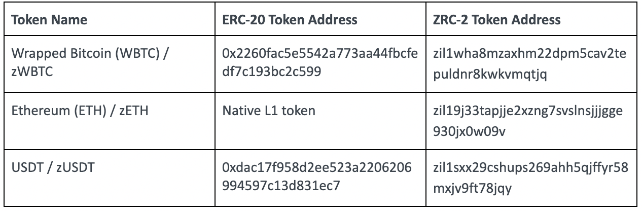 Listed below are the contract addresses for the Zilliqa-bridged ERC-20 tokens: