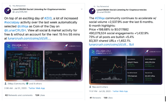 Social listening site LunarCRUSH utilised the ZIL-3 occasion to share some key highlights of recent our campaigns. They reported a massive upward trajectory with our social media activity, noting a +2,537.9% in the social volume over the last 6 months, nearly half a billion social engagements, with 73% of the mentions and posts being bullish in sentiment. The third edition of SocialPay, combined with the ZIL-3 event promotions culminated in explosive excitement across social media and resulted in us being named LunarCrush’s “Coin of the Day” on 31 July. We were truly honoured!