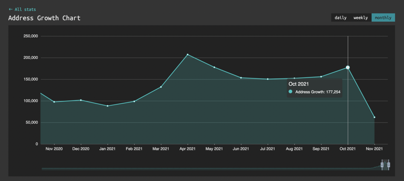 In October 2021, we saw 177k new wallet addresses created. This is a 13% increase compared to September 2021. The network saw 1.54m transactions, a slight increase from the 1.52m in September.